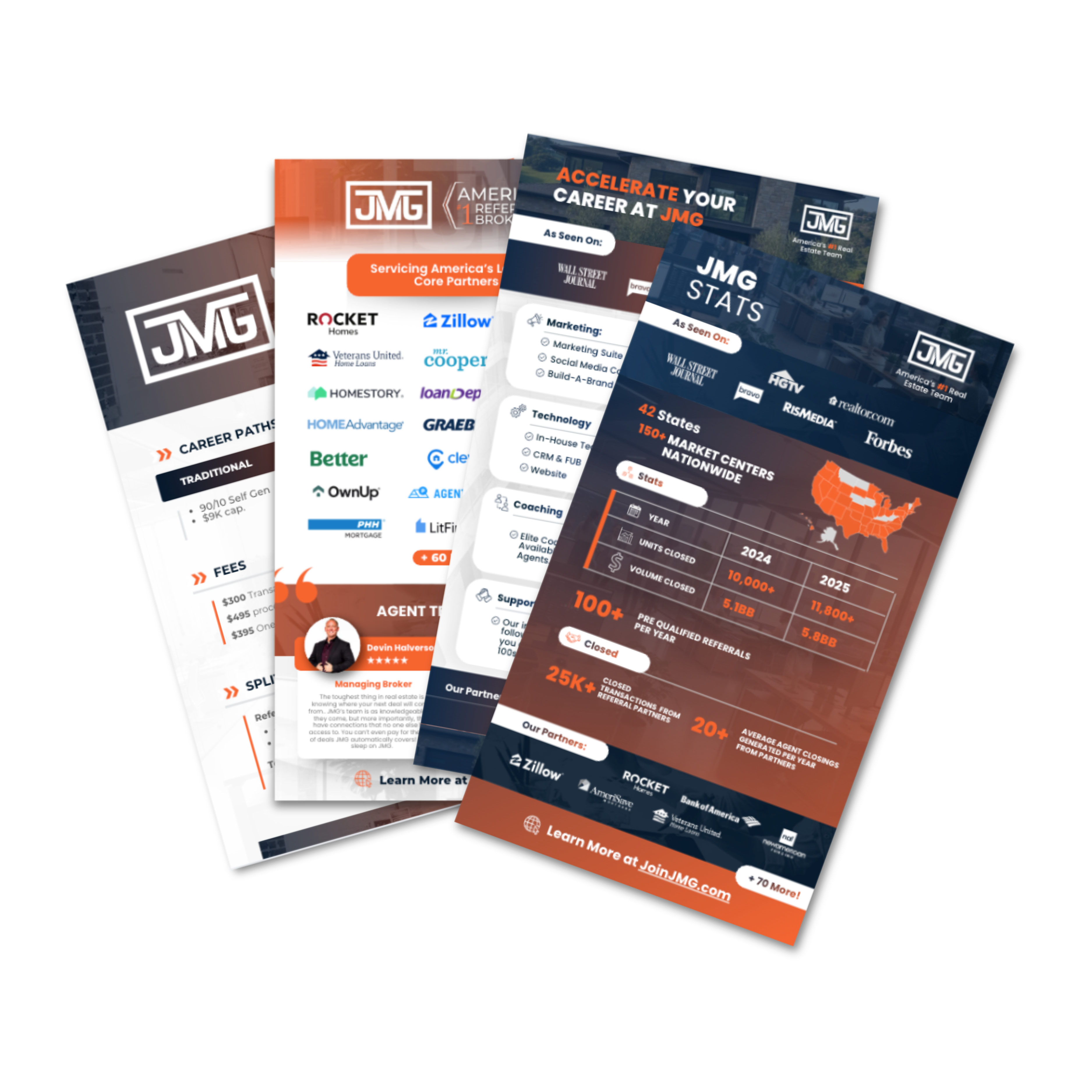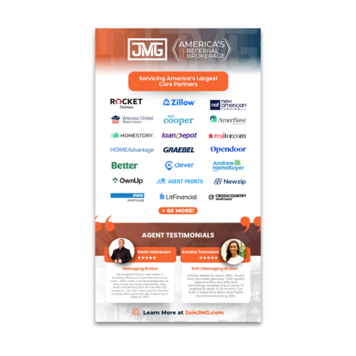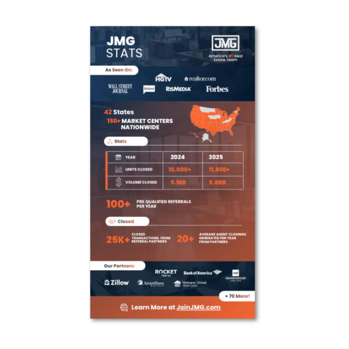 Highlights the measurable success JMG agents achieve annually, showcasing referral volume, average agent closings, and total transactions. This asset emphasizes JMG’s proven track record of growth, making it an effective tool for demonstrating the tangible results agents can expect.