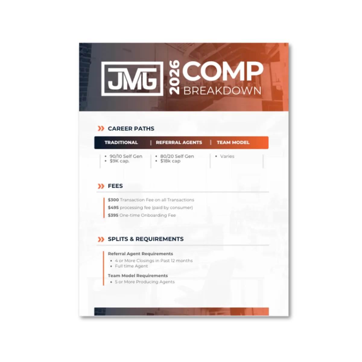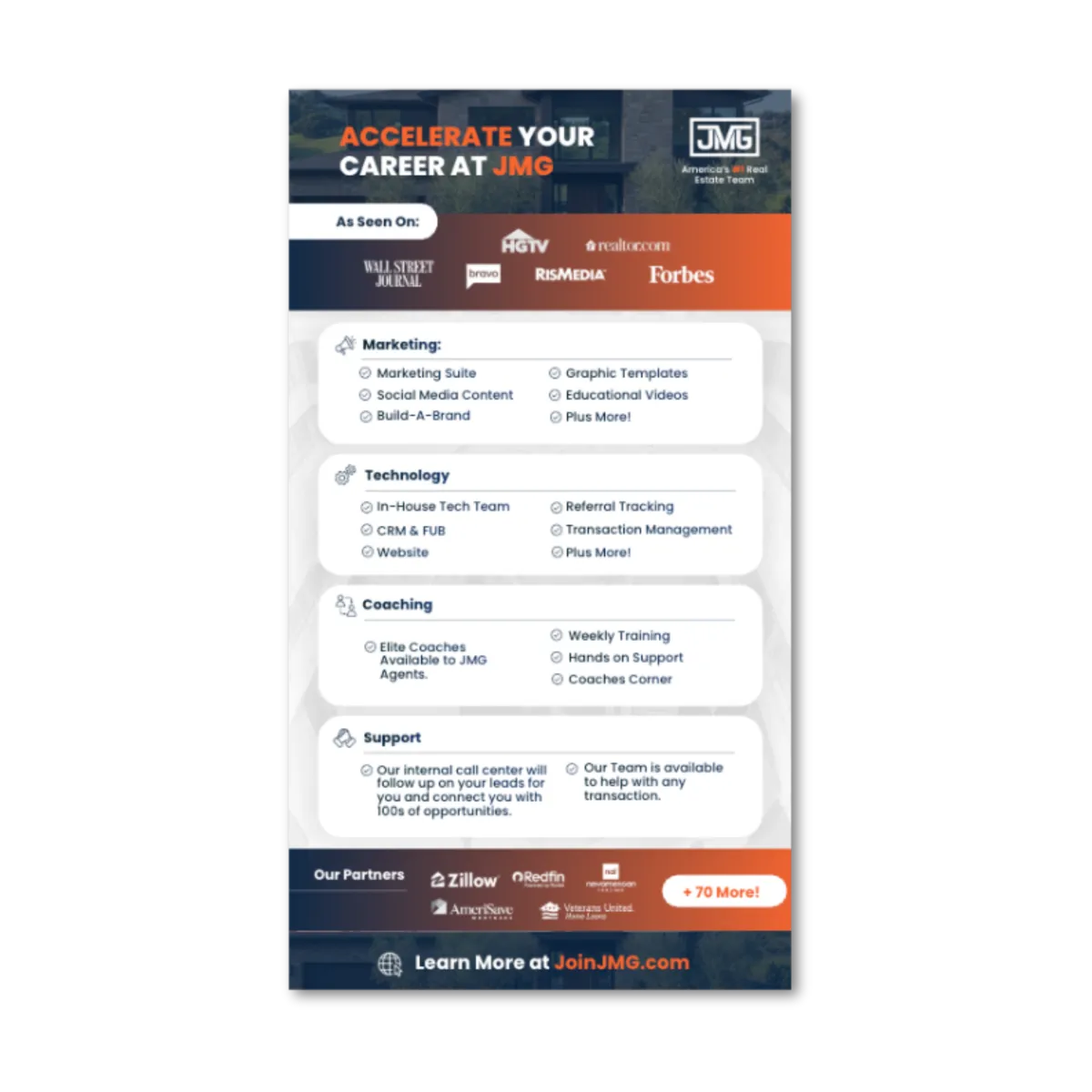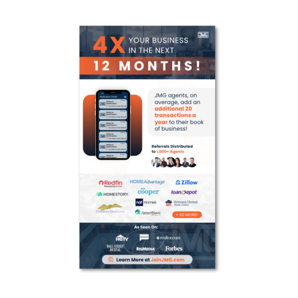 Highlights the measurable success JMG agents achieve annually, showcasing referral volume, average agent closings, and total transactions. This asset emphasizes JMG’s proven track record of growth, making it an effective tool for demonstrating the tangible results agents can expect.
