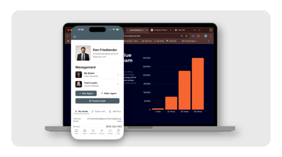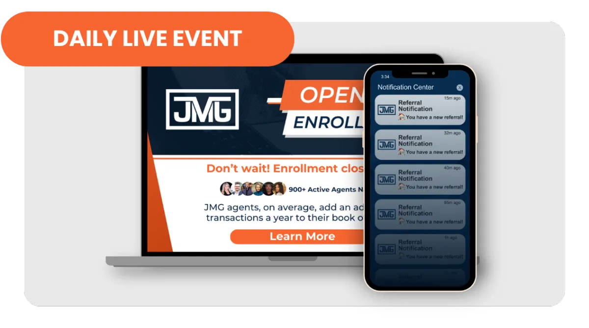 This website is designed to educate, empower, and equip you with the tools needed to leverage JMG Plus—the program that rewards our agents for helping us expand the JMG family. By referring talented agents to JMG, you create an ongoing revenue stream that grows with every transaction they close. With JMG Plus, you’re not just helping us grow—you’re growing your own income.