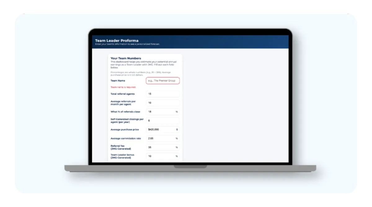 Referring a Team Leader to JMG is the first step in creating transformative growth for both their business and yours. Once you submit a referral, our team ensures a smooth and comprehensive process to onboard the brokerage or team. Due to the additional logistics involved in transferring leadership models, these transitions may take longer than individual agent referrals—but the rewards are well worth it.