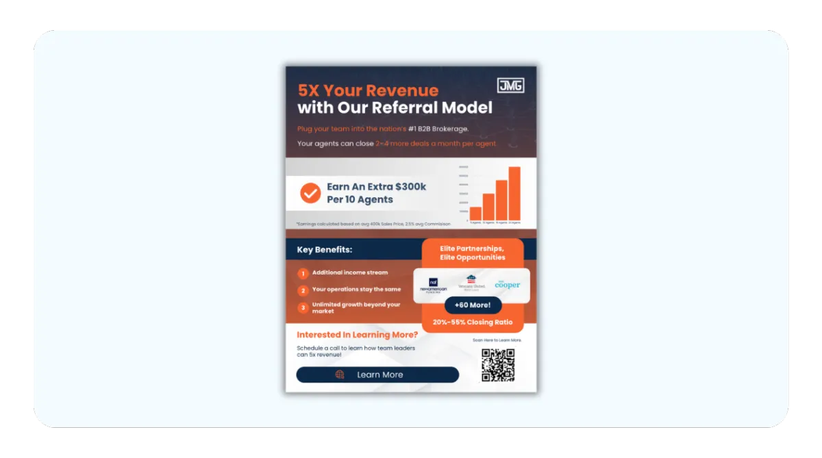 JMG's B2B referral model is designed to help team leaders scale their business by providing pre-qualified referrals from elite national partners. Our model reduces overhead costs and offers agents significant growth potential through a diversified portfolio of lending, consumer search, and relocation partnerships.